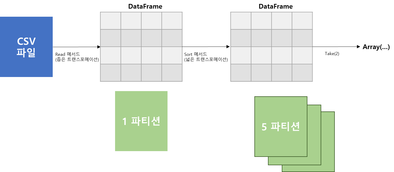DataFrame을 사용하면 파티션을 수동 혹은 개별적으로 처리할 필요가 없습니다. 물리적 파티션에 데이터 변환용 함수를 지정하면 스파크가 실제 처리 방법을 결정합니다.