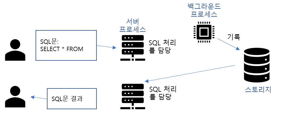 - 대부분의 백그라운드 프로세스는 서버 프로세스로부터 요청받기 전에는 아이들 상태, 아이들일 때는 'rdbms ipc message'를 기다리는 프로세스가 많음