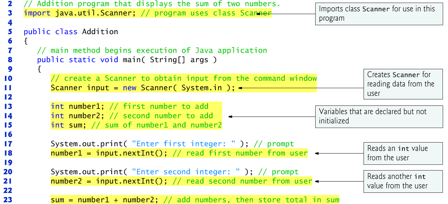 변수 number1, number 2 및 sum이 int 유형의 데이터를 보유한다고 선언합니다.