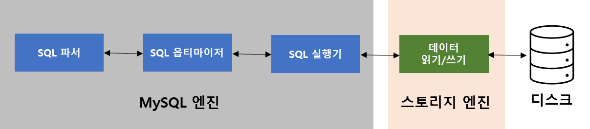 쿼리가 실행되면 대부분의 작업이 MySQL엔젠에서 처리하고, 마지막에 데이터 읽기와 쓰기 작업만 스토리지 엔진에 의해 처리된다. 만약 사용자가 스토리지 엔젠을 새로 만든다 해도 DBMS 전체 기능이 아니 일부분의 기능만 수행하는 엔진을 생성한다는 의미이다.