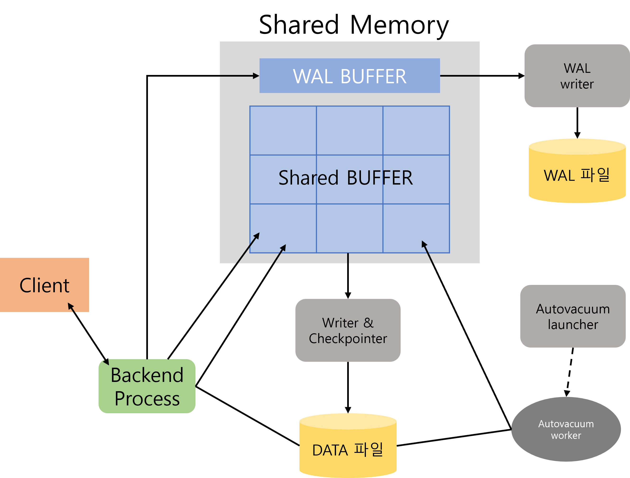 - stats collector: 세션 수행 정보 (pg_stat_activiry)와 테이블 사용 통계 정보 (pg_stat_all_tables)와 같은 DBMS 사용 통계 정보를 수집한다.